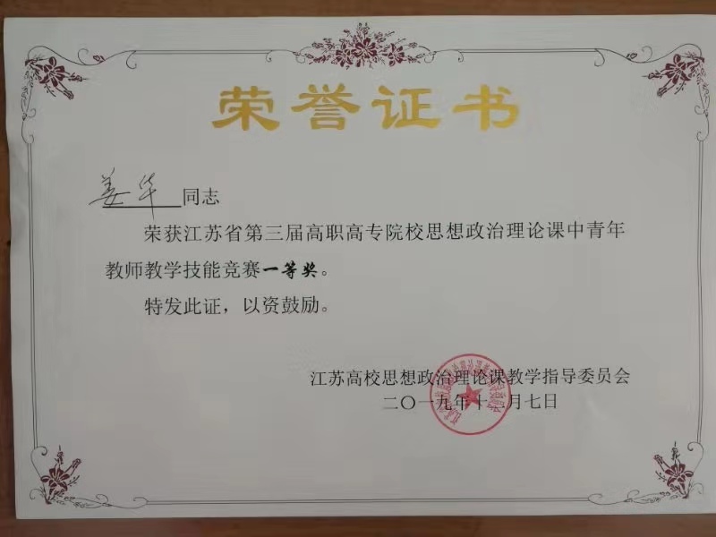 12月7日,江苏省第三届高职高专院校思想政治理论课中青年教师教学技能竞赛决赛在南京落下帷幕,我校马克思主义学院姜华老师荣获“毛泽东思想和中国特色社会主义理论体系概论”赛项一等奖。