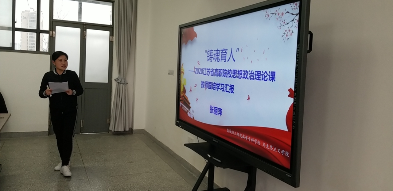 在学习交流汇报环节,张丽萍老师就其参加的2020年江苏省高职院校思想政治理论课教师国培进行了汇报交流。张老师通过三个部分对该次培训计划做具体汇报,主要包括国培班的生活、国培班的学习和国培心得体会。张老师表示国培班的生活丰富多彩,在班主任的倡导下于教师节当晚举办庆祝活动,节目形式多样,得到了省教育厅的肯定。在培训期间,各位专家们的讲座主要围绕思想政治理论课展开,如佘远富教授提出以提升亲和力为导向的思想政治理论课教学实践,让人受益匪浅。最后,张老师还分享了心得体会,她认为,作为一名思政教师必须不断更新教学的方式方法,用马克思主义理论武装头脑,增强责任感、使命感。