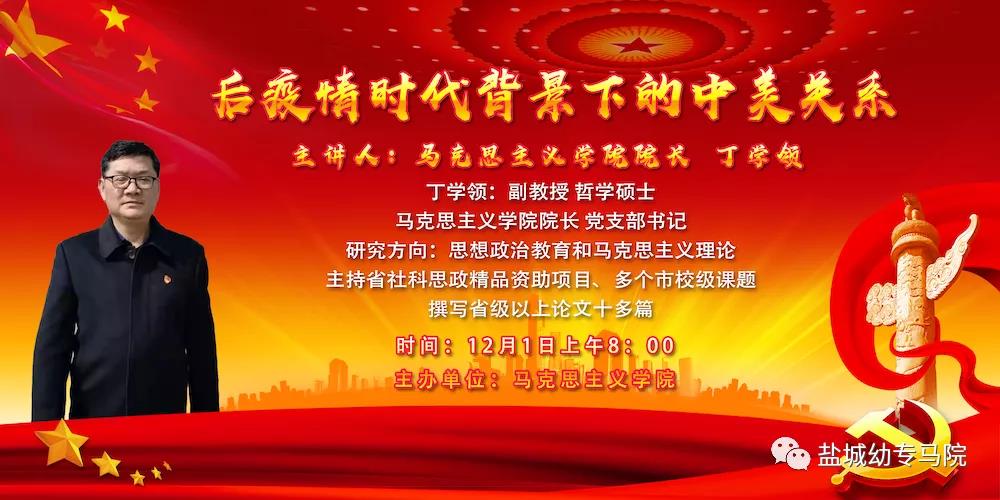 12月1日上午,由马克思主义学院主办的青马讲堂第六期讲座在海洋路校区鲁艺剧场顺利开讲。马克思主义学院院长丁学领为大家做了题为《后疫情时代背景下的中美关系》的专题讲座。本次讲座由马克思主义学院副院长周克明主持,马克思主义学院部分教师和学前教育学院、人文教育学院部分学生参加了本次活动。