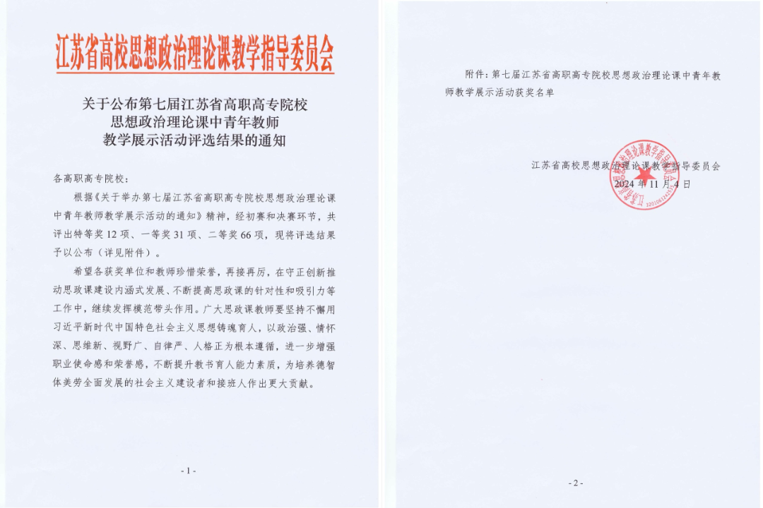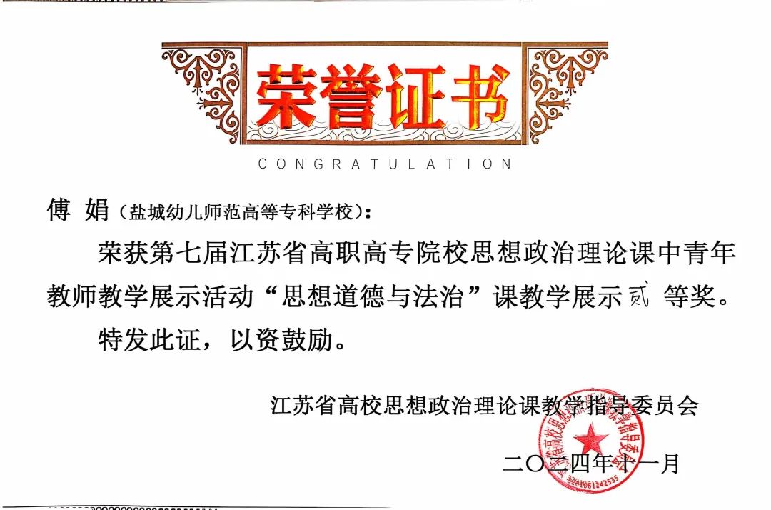 近日,第七届江苏省高职高专院校思想政治理论课中青年教师教学展示活动在江苏航运职业技术学院和南京信息职业技术学院落下帷幕圆满落幕。本次活动由江苏省高校思想政治理论课教学指导委员会高职分教指委主办,全省94所高职高专院校、100多名优秀中青年思政课教师经过校内选拔、省内初赛进入现场教学环节,展示教学风采。最终,我院傅娟老师荣获《思想道德与法治》课程组二等奖。